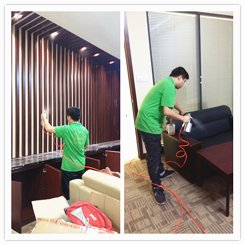 工程師對辦公家具油漆面、地毯等,高壓噴涂苯、TVOC清除劑,高效清除苯污染,清除苯污染異味。