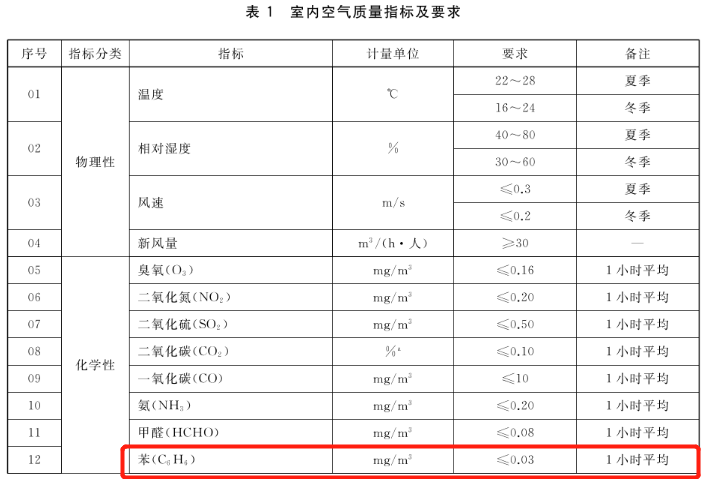 新版GB/T 18883-2022《室內空氣質量標準》將 GB/T 18883—2002 中推薦的苯標準值≤0.11mg/m3修訂為 ≤0.03 mg/m3。